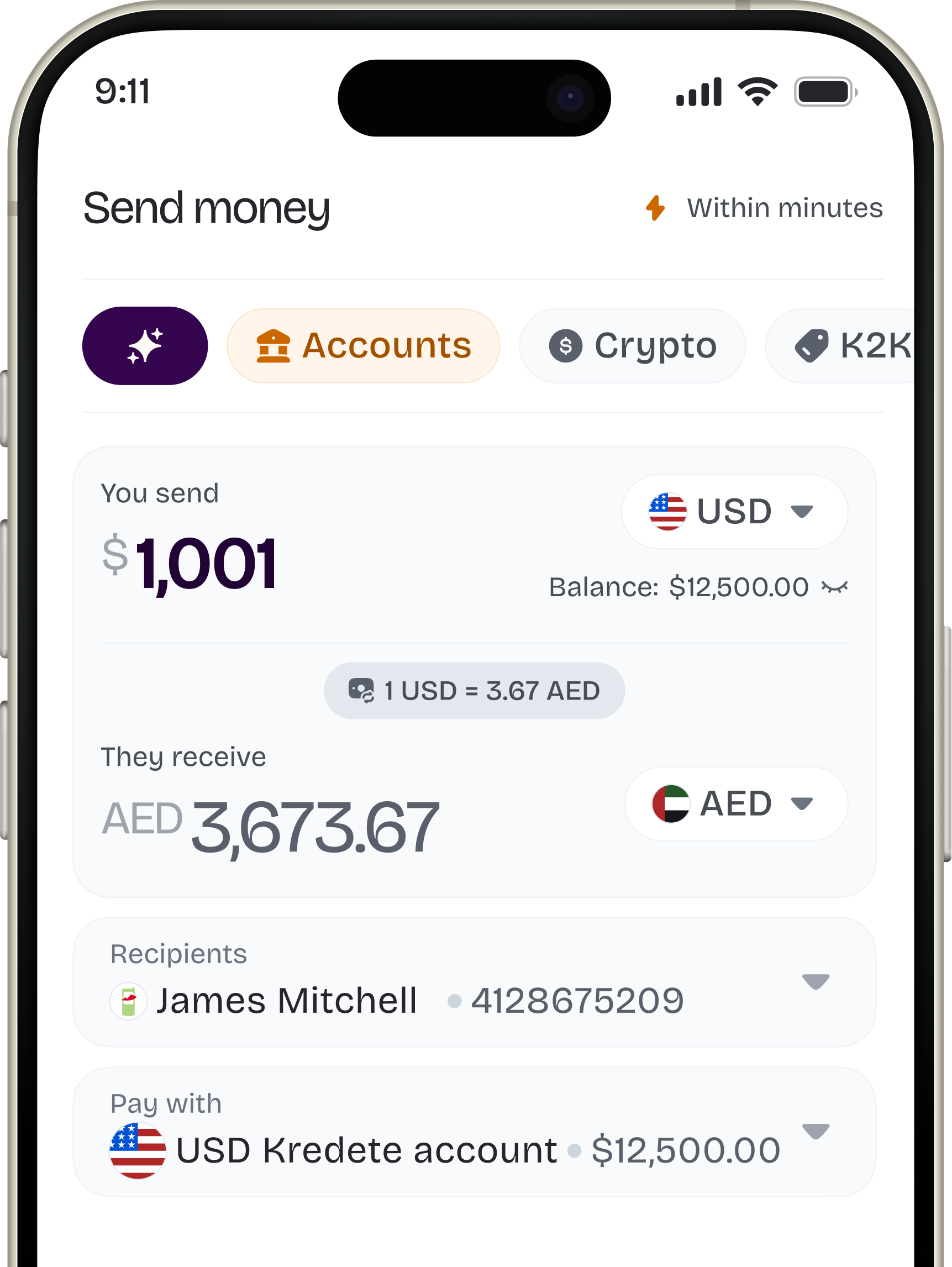 Most transfers are completed within seconds. Timing varies by corridor and payment method.
